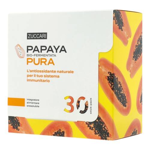 PAPAYA PURADescrizione Integratore alimentare interamente costituito da polpa di carica papaya bio-fermentata, atomizzata e granulata. Papaya Pura contrasta i radicali liberi e sostiene le difese immunitarie. Ingredienti Papaya (Carica papaya L.) polpa del frutto bio-fermentata, atomizzata e granulata (100 %). Non contiene coloranti, conservanti, additivi chimici, OGM e derivati, aromatizzanti. Senza glutine. Caratteristiche nutrizionali Valori medi per 3 g (dose giornaliera consigliata) per 100 g Energia 47,58 kJ / 11,19 kcal 1.586 kJ / 373 kcal Grassi di cui acidi grassi saturi 0 g 0 g 0 g 0 g Carboidrati di c...